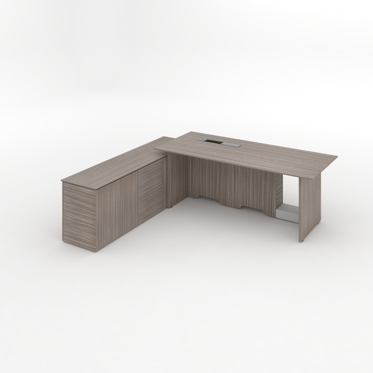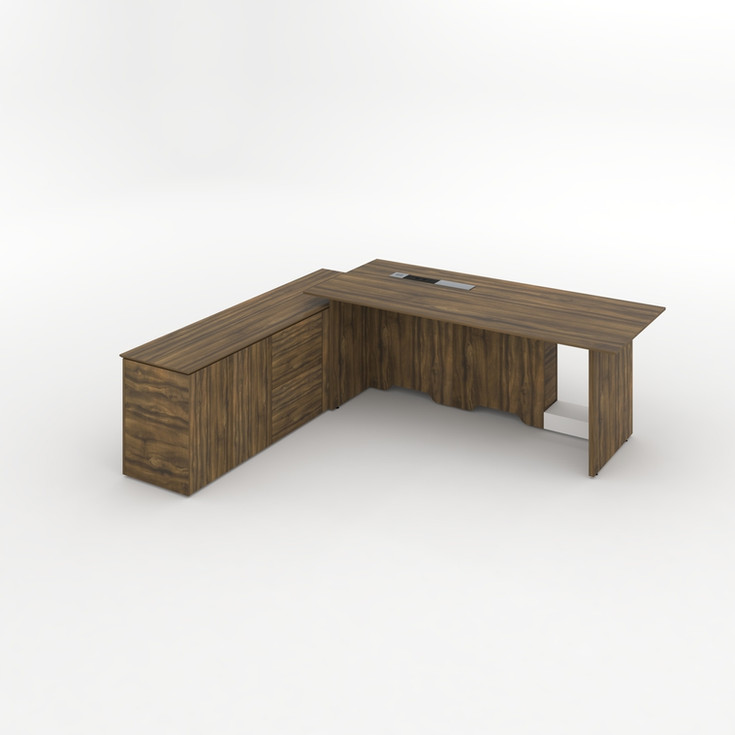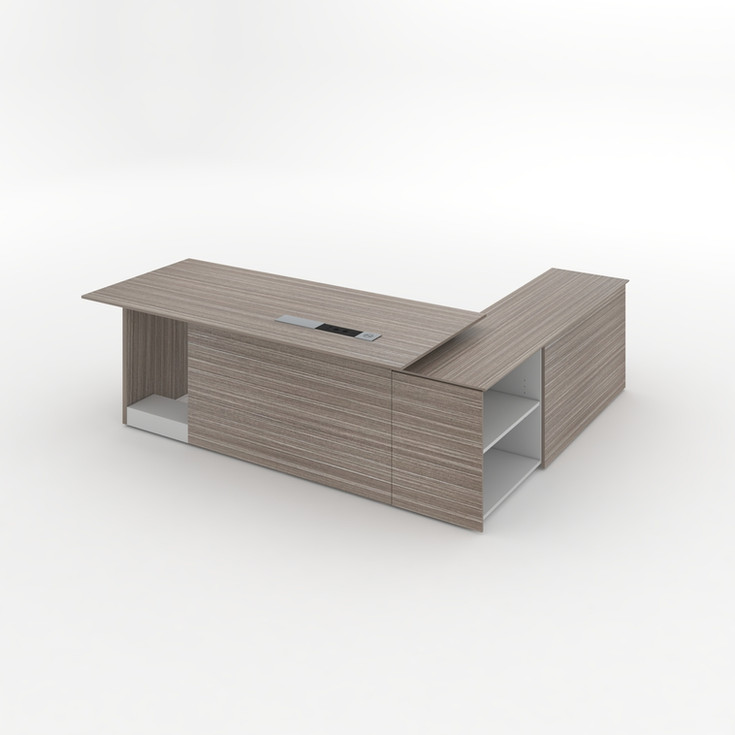 Melamine Executive desk LEFT in 2050W*1000D*750H - Hidden wire system under the desk top, Sliding socket with three charge, one USB and Type C - Wireless charge - 16mm thick top in plywood, and 25mm thick panel legs - Steel frame under the desk top - Cabinet connected - 18mm particleboard all over. One adjustable shelf for each cabinet - Adjustable feet - Cabinet with 2 swing doors - 1 cabinet with 2 drawers - 1 cabinet with opened shelves (See the picture)