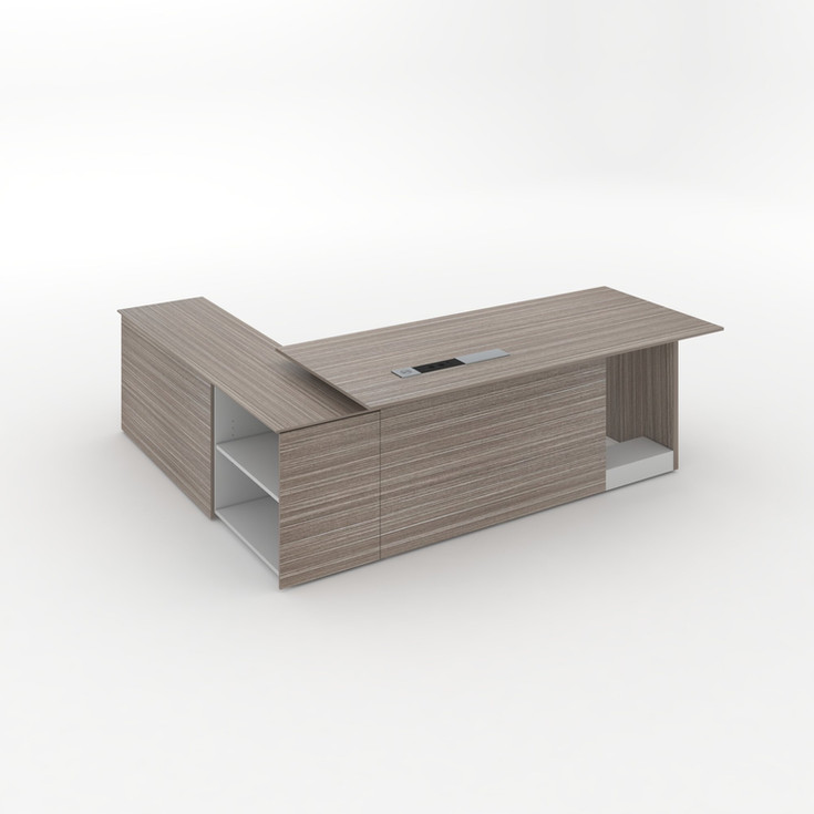 Melamine Executive desk LEFT in 2050W*1000D*750H - Hidden wire system under the desk top, Sliding socket with three charge, one USB and Type C - Wireless charge - 16mm thick top in plywood, and 25mm thick panel legs - Steel frame under the desk top - Cabinet connected - 18mm particleboard all over. One adjustable shelf for each cabinet - Adjustable feet - Cabinet with 2 swing doors - 1 cabinet with 2 drawers - 1 cabinet with opened shelves (See the picture)