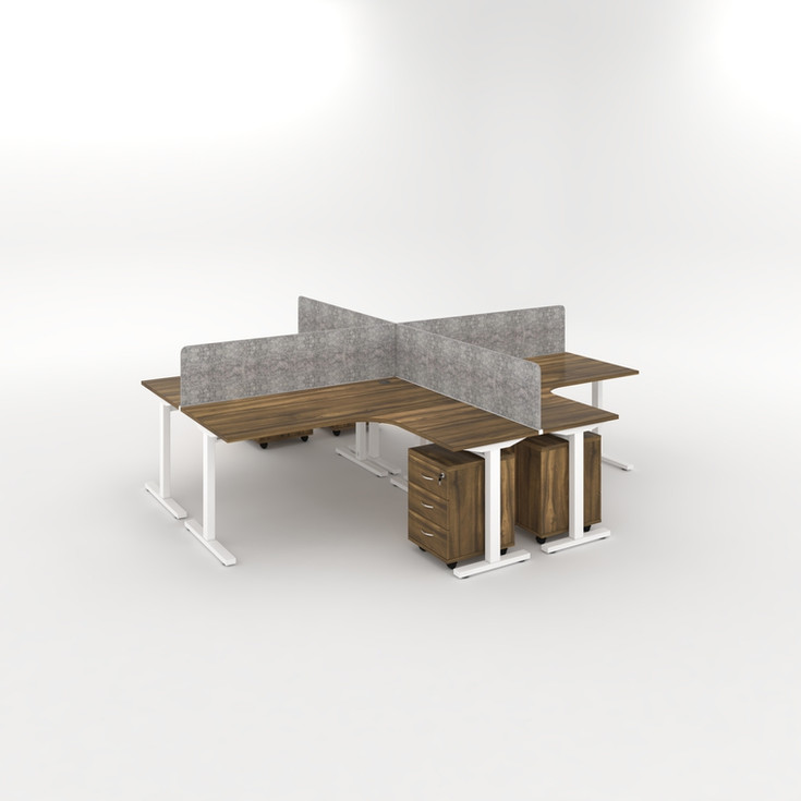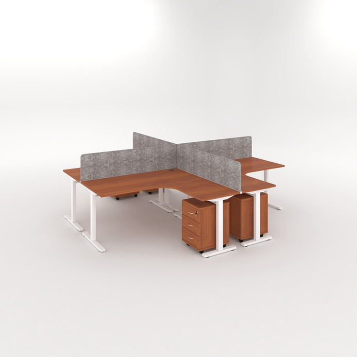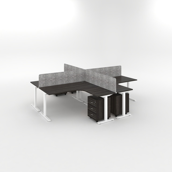 Office desk cluster available for 3 and 4 working stations (More design and dimensions under request) - 25 mm thick MDF top with E1 panel - 2 mm thick ABS edge - 2 cable holes (right and left) - Metal legs with T shape - Modesty panel NOT Included - Adjustable beam and Hidden wire system - Acoustic panels