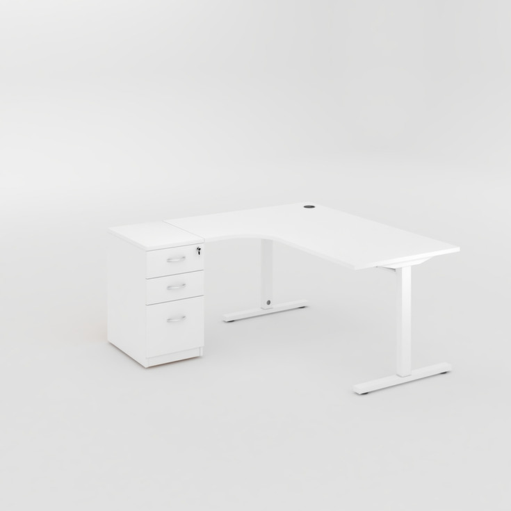 Bureau avec retour et tiroir - Plateau en MDF épaisseur 25 mm avec panneau E1 - Chant ABS épaisseur 2 mm - 2 trous pour câbles (droite et gauche) - Pieds en métal en forme de T - Voile de fond PAS inclus - Fix caisson avec avec 3 tiroirs - Serrure à clé - charnières métalliques coulissantes pour tiroirs - Poutre réglable et système de câblage caché