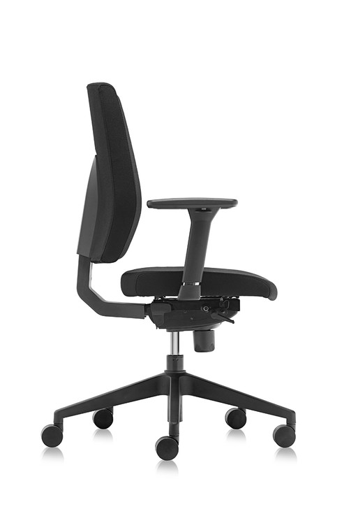 Task chair with medium back - PU castors Diam 60 mm - Nylon base Ray 340 - Gaslift Bifma Tested Class 4 - Stroke 120 mm - Synchro Mechanism with 2 handles lockable in 4 positions with adjustable tension and seat front tilt function - Antishock system - Sliding seat system - High Quality moulded foam for the seat - 3D adjustable armrests with soft PU pad - Comfortable back shape for a better working position with fabric back upholstery - Moulded foam for backrest - Back adjustable in height - 4 positions