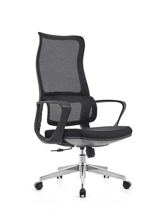 Chaise de bureau à dossier haut - Roulettes en PU de 50 mm de diamètre - Piètement chromé Ray 350 - Vérin à gaz homologué BIFMA classe 2 - Course de 120 mm - Mécanisme d'inclinaison à tension réglable et verrouillable en 2 positions - Épaisseur du métal : 2,5 mm - Assise en mousse moulée haute qualité - Dossier en résille - Accoudoirs en nylon noir intégrés à la structure - Soutien lombaire fixe